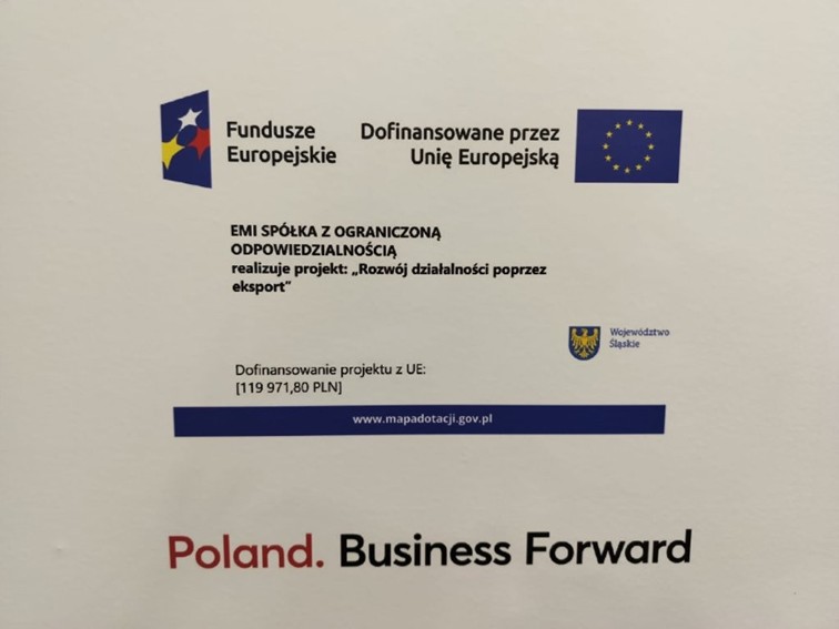 EMI sp. z o.o. realizuje Działanie pn. „Rozwój działalności poprzez eksport” dofinansowane w ramach Programu Fundusze Europejskie dla Śląskiego 2021-2027 oraz w ramach współfinansowania krajowego z budżetu państwa w ramach projektu „InterGlobal - internacjonalizacja przedsiębiorstw sektora MŚP z województwa śląskiego”.